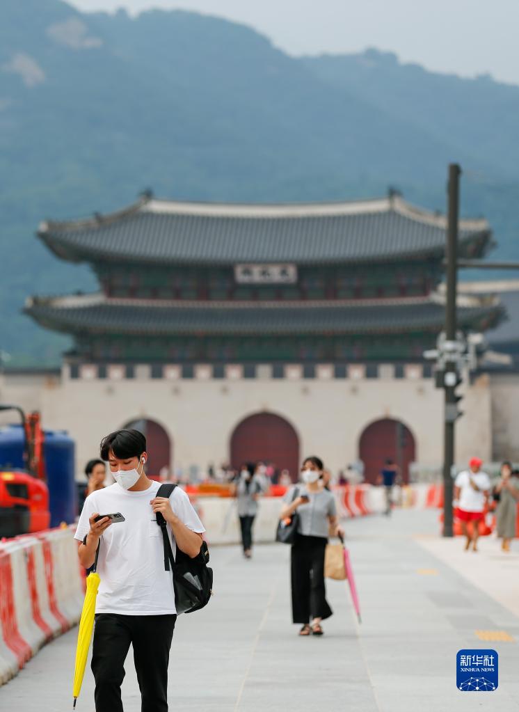8月3日,行人佩戴口罩走在韓國首爾光化門(mén)廣場(chǎng)。