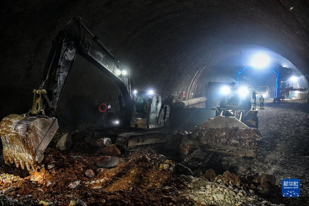 8月4日,在位于廣西環(huán)江毛南族自治縣的貴南高鐵大方山隧道內,挖掘機在清理隧道貫通爆破后產(chǎn)生的土石方。