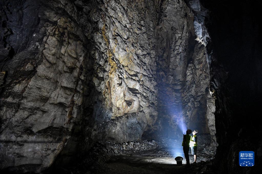8月3日,在位于廣西環(huán)江毛南族自治縣的貴南高鐵大方山隧道內,技術(shù)人員在查看施工中發(fā)現的溶洞。