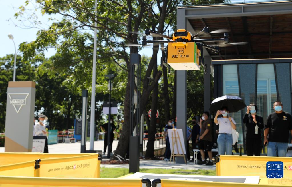 8月4日,一架載有訂單咖啡的無(wú)人機在咖啡店門(mén)前起飛開(kāi)始派送。