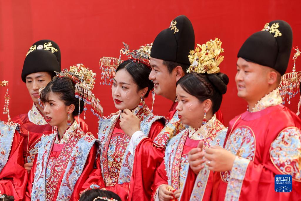 當日是七夕,2022(壬寅)年貴陽(yáng)孔學(xué)堂中華婚禮在貴陽(yáng)孔學(xué)堂舉辦,12對新人身穿中式婚服通過(guò)合巹禮、解纓結發(fā)、共書(shū)婚帖等方式完成傳統婚禮儀式。