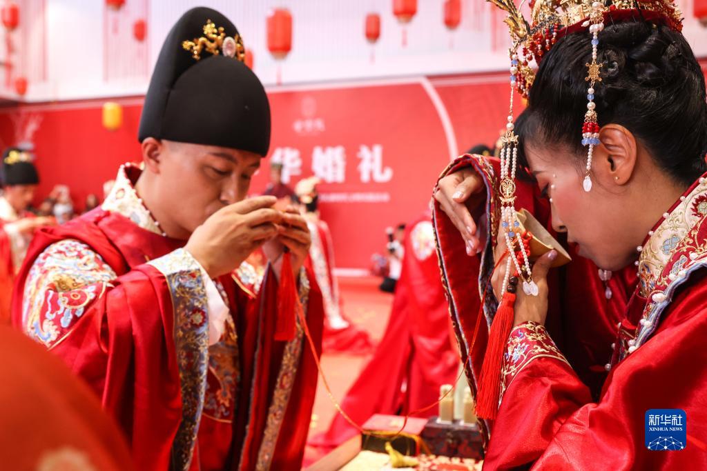 當日是七夕,2022(壬寅)年貴陽(yáng)孔學(xué)堂中華婚禮在貴陽(yáng)孔學(xué)堂舉辦,12對新人身穿中式婚服通過(guò)合巹禮、解纓結發(fā)、共書(shū)婚帖等方式完成傳統婚禮儀式。