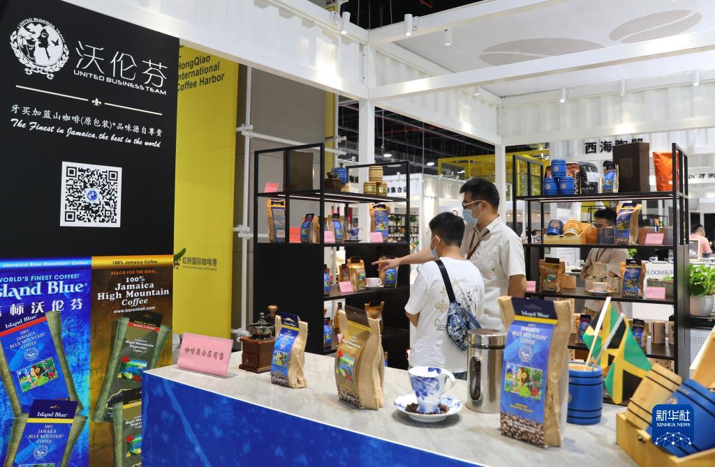 8月4日,一家進(jìn)口咖啡企業(yè)的員工(右)向顧客介紹咖啡產(chǎn)品。