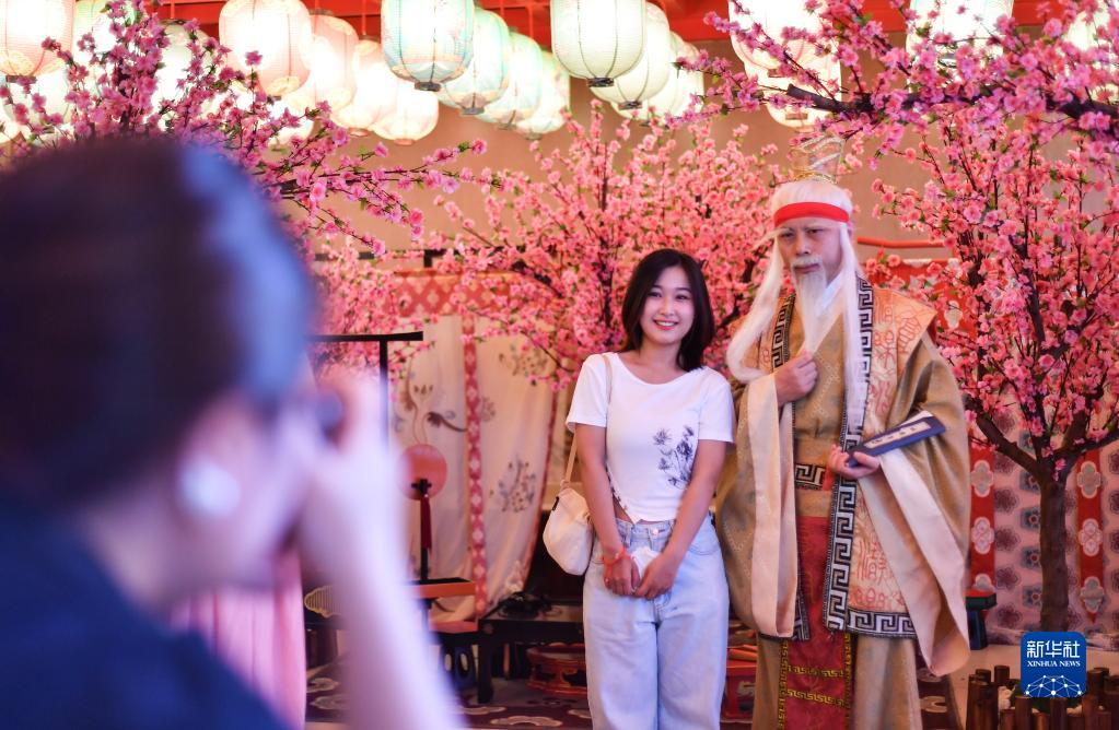 8月4日,游客在“長(cháng)安十二時(shí)辰”主題街區與扮演“月老”的演員(右)合影。