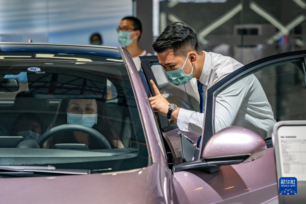 8月4日,工作人員(右)在第23屆中國(昆明)國際汽車(chē)博覽會(huì )上向參觀(guān)者介紹展車(chē)。
