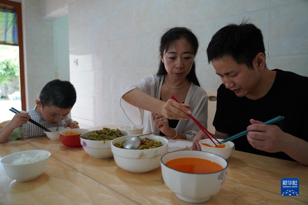 在四川省什邡市馬井鎮同心村,王忠禮一家在就餐(8月2日攝)。