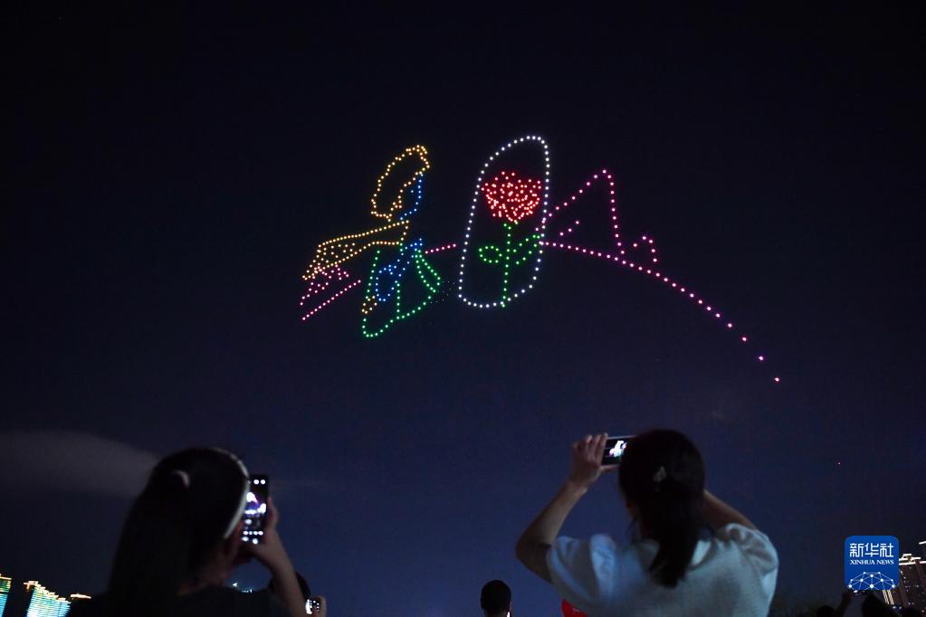 當日是七夕節,一場(chǎng)無(wú)人機光影秀在湖南省長(cháng)沙市湘江畔上演,吸引市民駐足觀(guān)看。