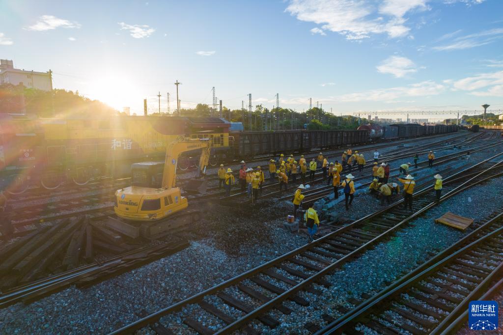 8月5日,在株洲北站編組場(chǎng),鐵路工人們正在換岔施工(無(wú)人機照片)。