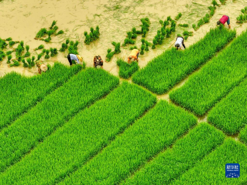 8月5日,在湖南省永州市道縣壽雁鎮玉蟾巖稻作文化園,農民在起獲晚稻秧苗(無(wú)人機照片)。
