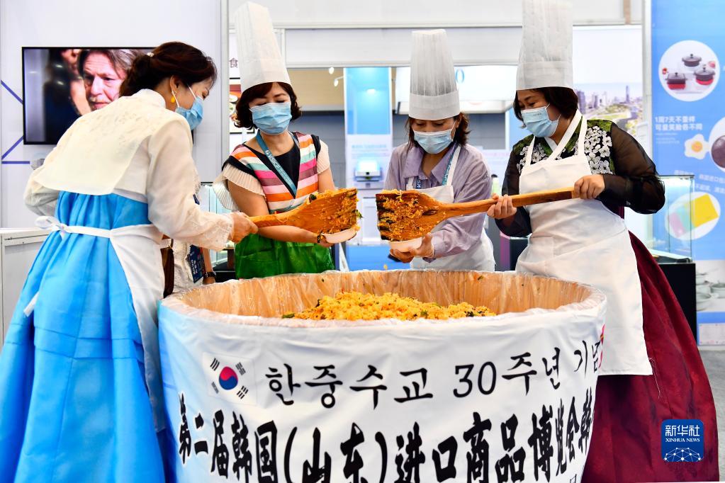 8月5日,在山東省威海市,韓國參展人員在第二屆韓國(山東)進(jìn)口商品博覽會(huì )上制作韓國傳統美食。