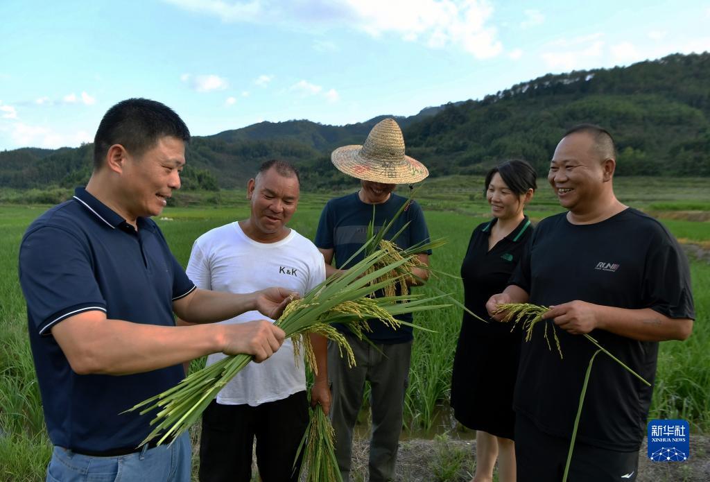在福建南平市延平區南山鎮,科技特派員陳鐘佃(左一)向當地農民講解水稻種植相關(guān)技術(shù)(8月3日攝)。