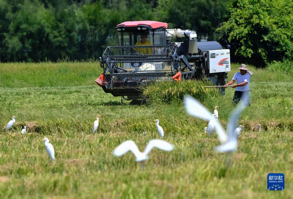 在福建福清市東瀚鎮的稻田里,收割機在稻田里搶收早稻(8月4日攝)。