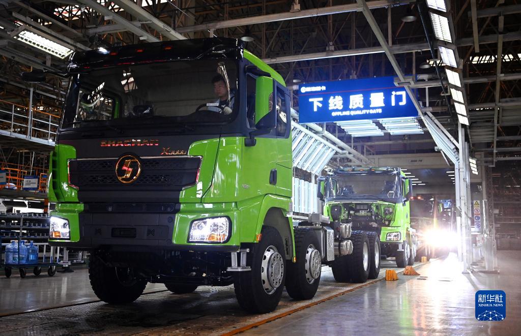 在陜西汽車(chē)控股集團有限公司總裝車(chē)間,車(chē)輛通過(guò)下線(xiàn)質(zhì)量門(mén)(2022年7月12日攝)。