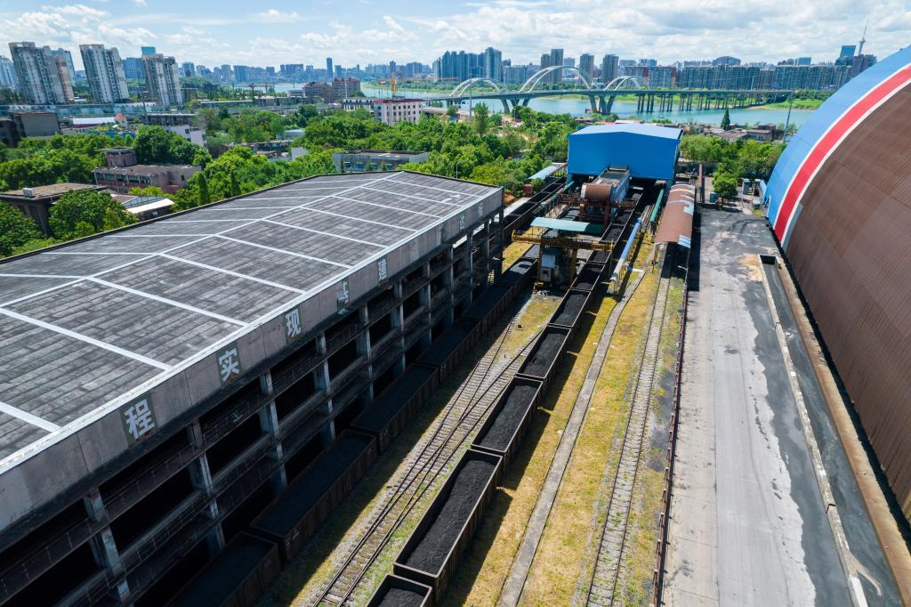 8月5日,滿(mǎn)載電煤的列車(chē)駛入大唐華銀株洲發(fā)電有限公司燃運部(無(wú)人機照片)。