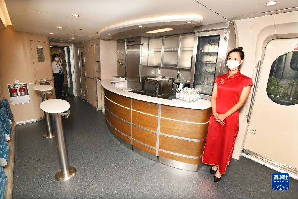 這是8月5日在位于山東省青島市的中車(chē)四方股份公司拍攝的雅萬(wàn)高鐵高速動(dòng)車(chē)組餐車(chē)內部。