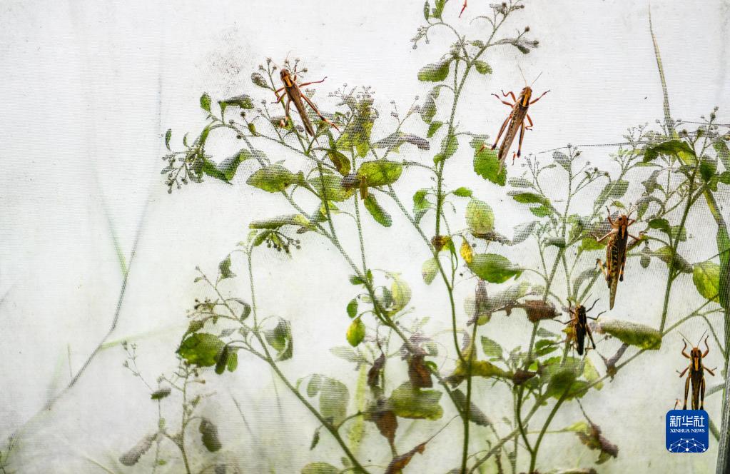在貴州省臺江縣臺盤(pán)鄉棉花村拍攝的大棚養殖的螞蚱(8月3日攝)。