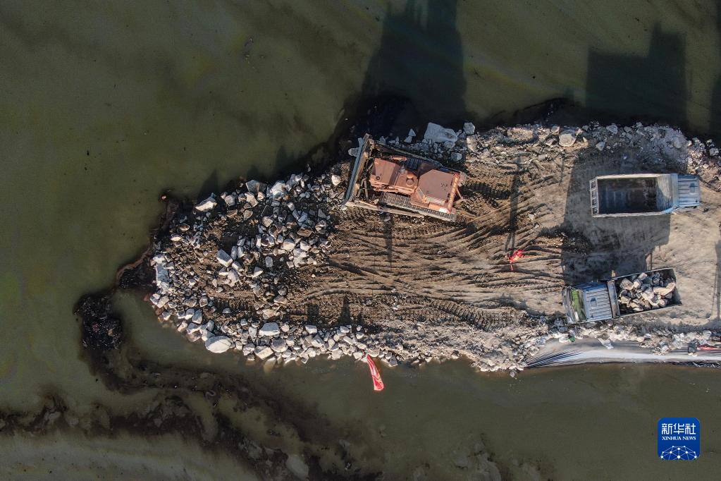 8月5日,中國安能集團搶險人員在潰口處駕駛推土機對潰口進(jìn)行封堵作業(yè)(無(wú)人機照片)。