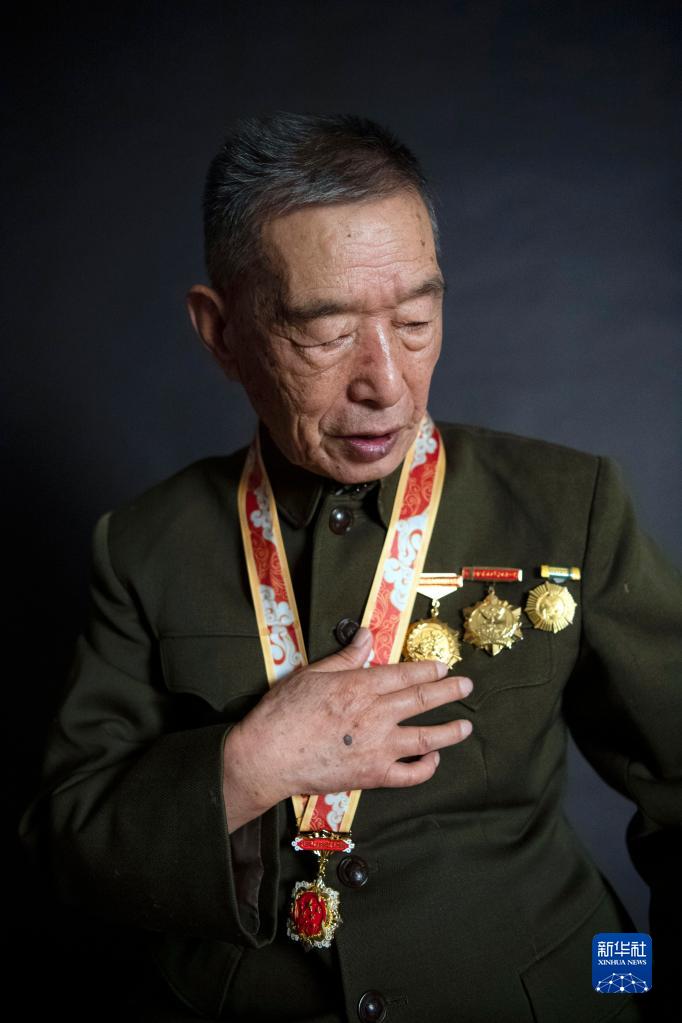 6月9日,在山西省太原市,抗戰老戰士李聯(lián)倉撫摸紀念章。