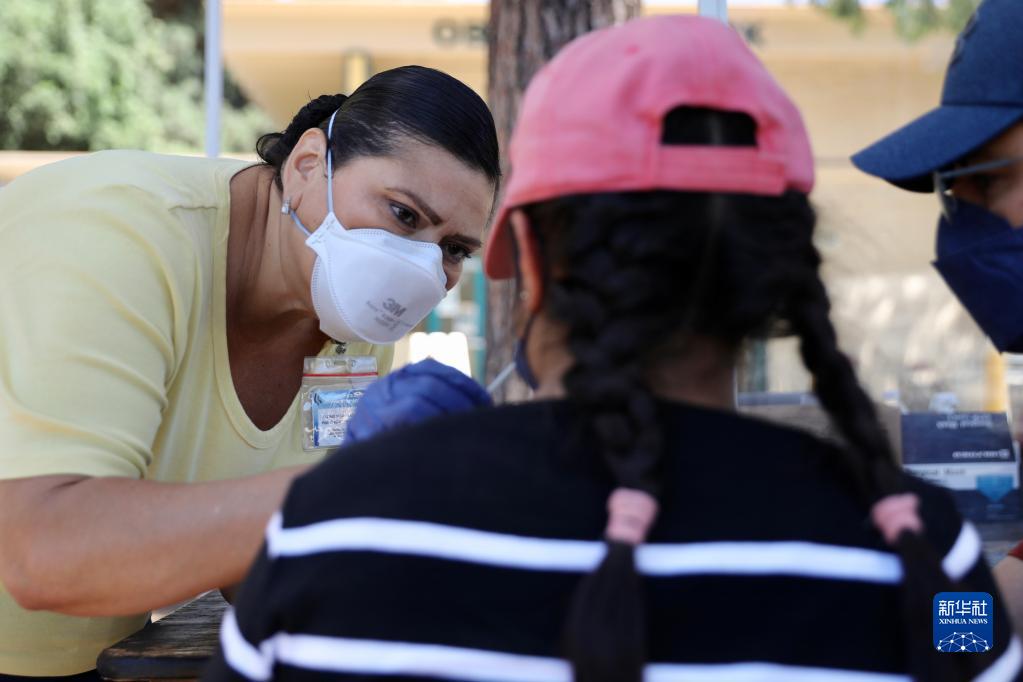 8月5日,在美國加利福尼亞州洛杉磯縣,居民接受衛生防疫人員的檢測取樣。