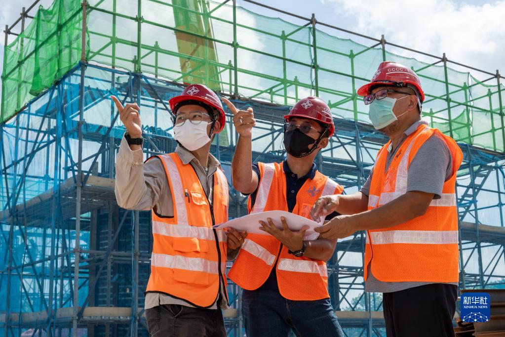 7月25日,西亞赫明(中)在位于馬來(lái)西亞彭亨州的馬東鐵項目六分部施工現場(chǎng)工作。