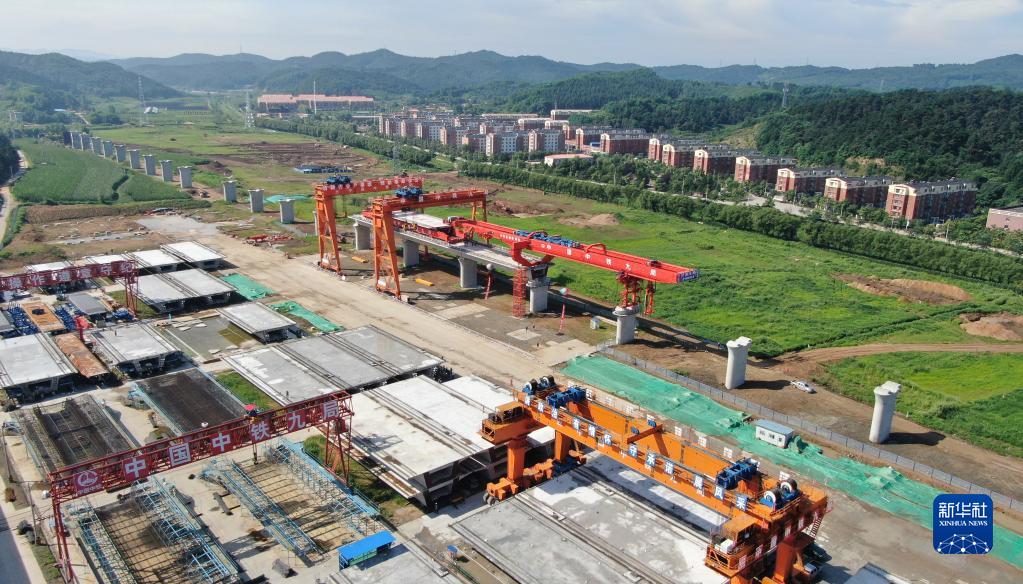 8月6日拍攝的沈白高鐵首孔箱梁架設現場(chǎng)(無(wú)人機照片)。