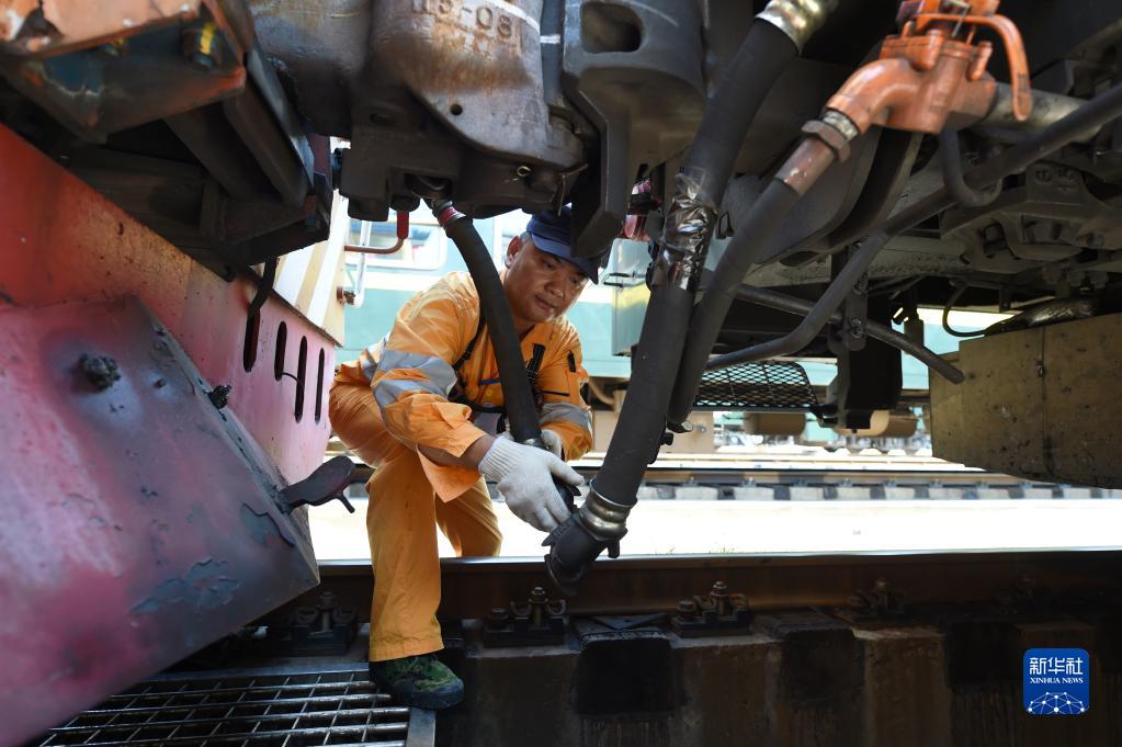 8月5日,合肥火車(chē)站運轉車(chē)間調車(chē)長(cháng)李健在連接調車(chē)機車(chē)與車(chē)輛制動(dòng)軟管,對列車(chē)進(jìn)行編組。