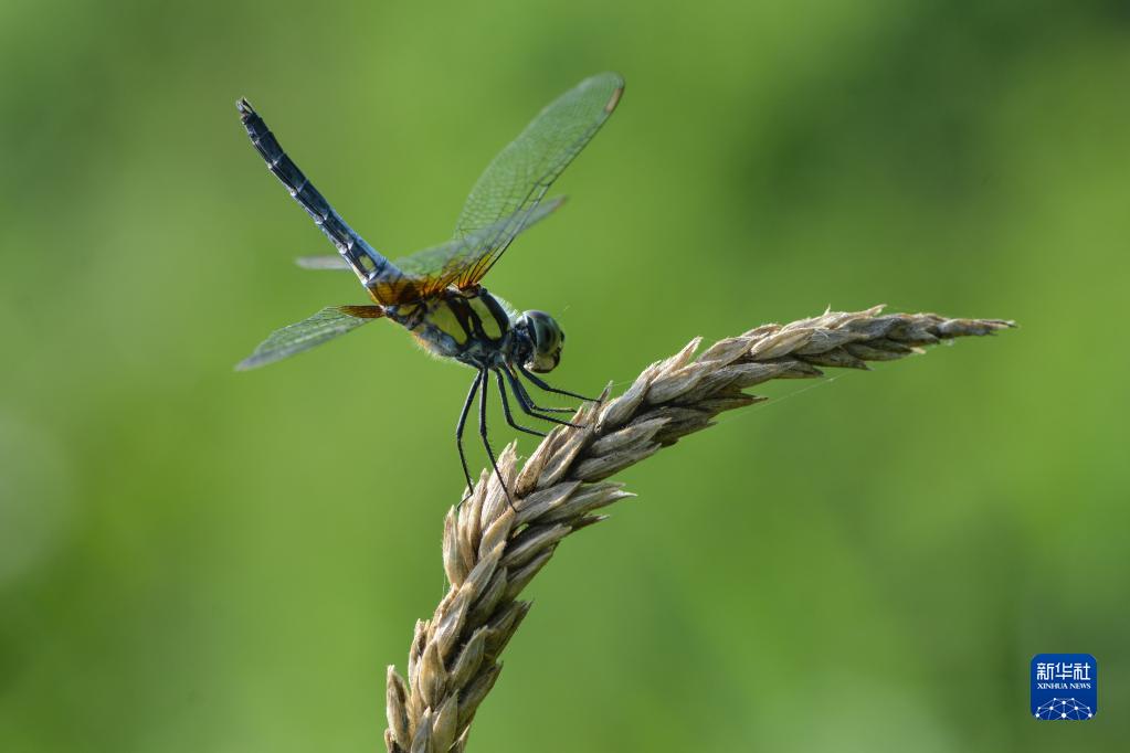 8月2日,在安徽省阜陽(yáng)市臨泉縣呂寨鎮楊莊村,一只蜻蜓停留在植物上。