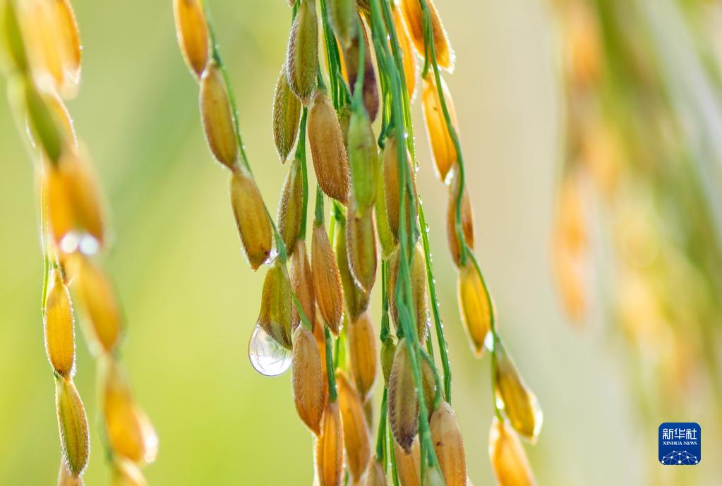 7月24日,在廣西南寧市邕寧區蒲廟鎮,稻穗上掛著(zhù)露珠。