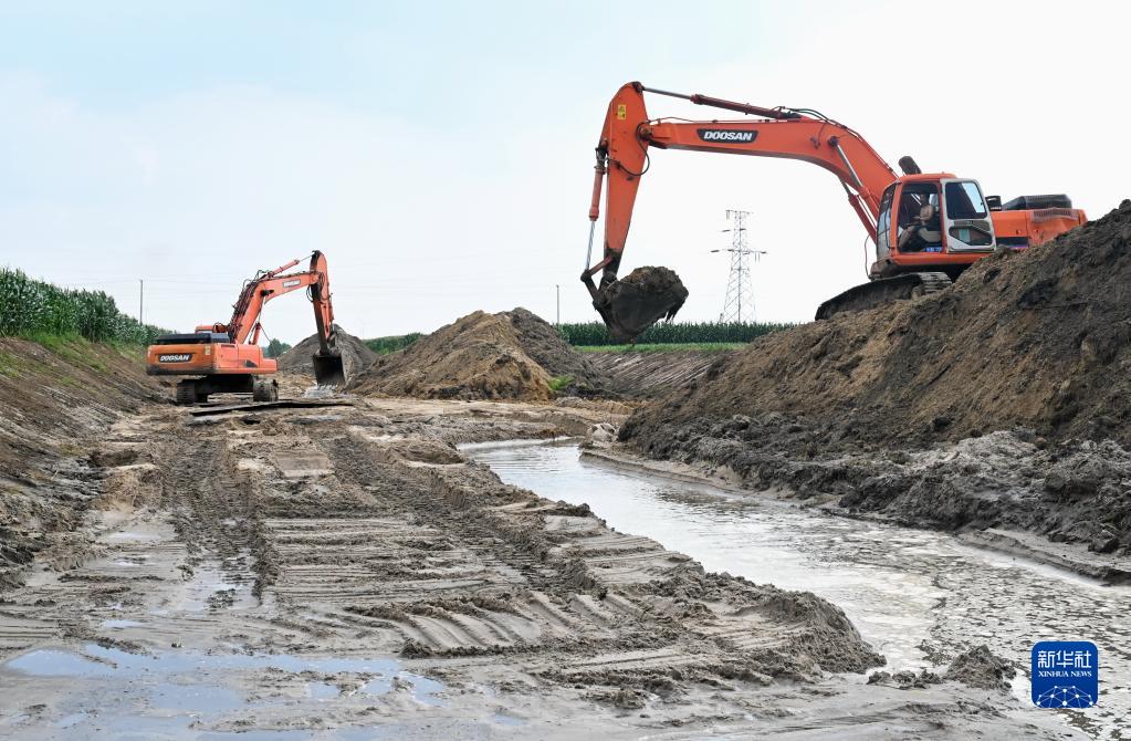 8月5日,工人在昌黎縣新集鎮境內的引灤河水灌渠清淤現場(chǎng)施工。