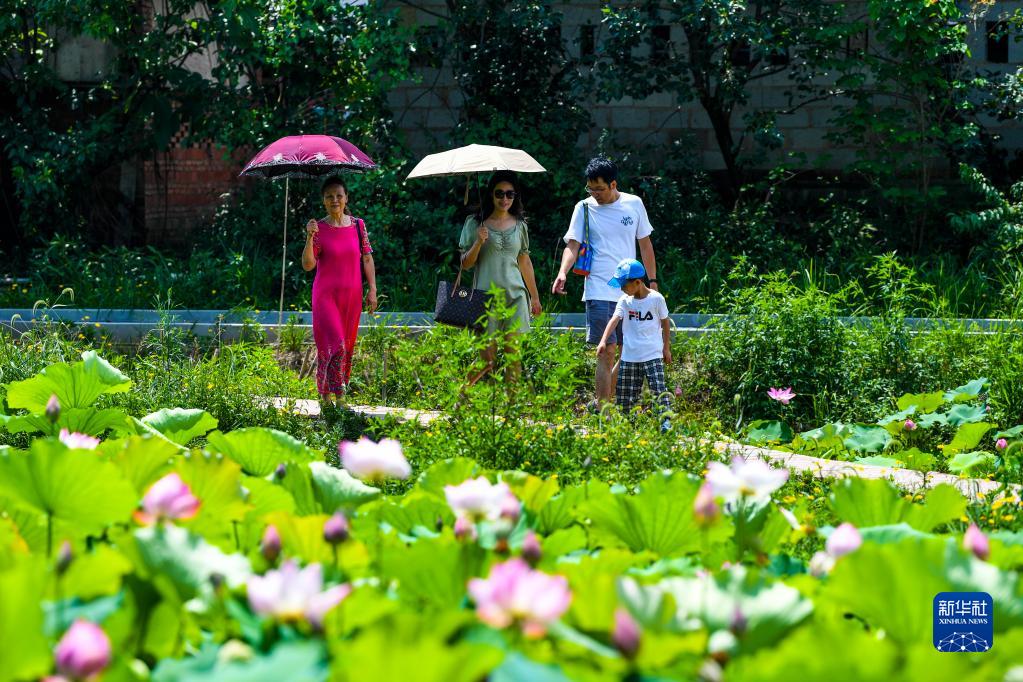 8月3日,游客在重慶市萬(wàn)州區恒合土家族鄉石坪村“荷花廊道”游覽。