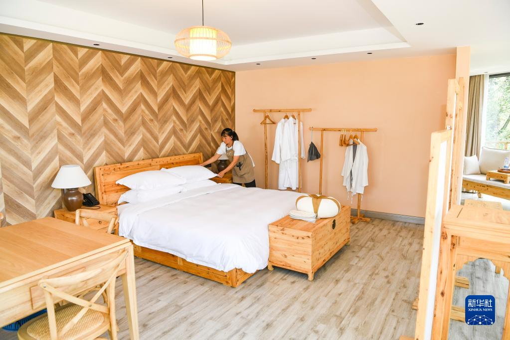8月2日,重慶萬(wàn)州三峽恒合旅游度假區一家民宿的工作人員在整理房間。