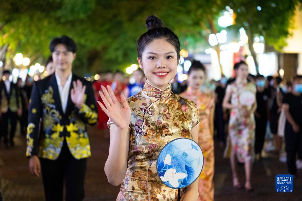8月5日,模特在哈爾濱市中央大街巡游。