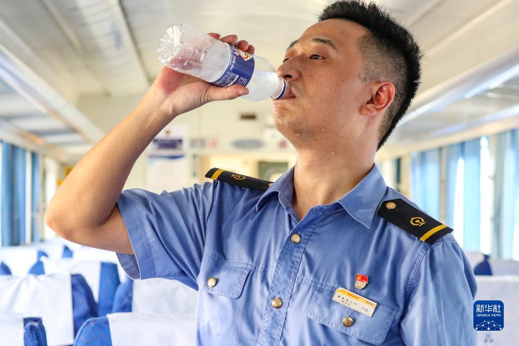 8月5日,在重慶西客車(chē)整備所,守車(chē)車(chē)長(cháng)丁璐在巡查K1153次列車(chē)途中喝水解渴。
