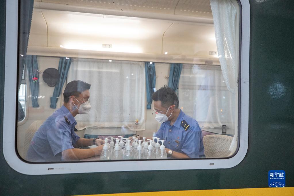 8月5日,在重慶西站K1153 次列車(chē)上,守車(chē)車(chē)長(cháng)丁璐(右)與終到列車(chē)班組列車(chē)長(cháng)清點(diǎn)物品并交接。