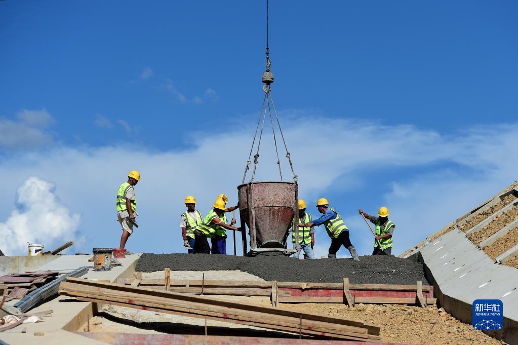 8月6日,工人在中鐵十一局池黃鐵路11號路基工地澆筑混凝土。