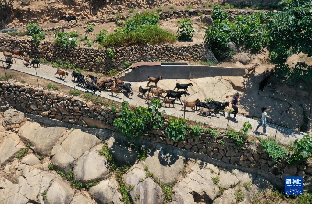 8月5日,汪淇(前)和父親行走在山羊養殖場(chǎng)的路上(無(wú)人機照片)。