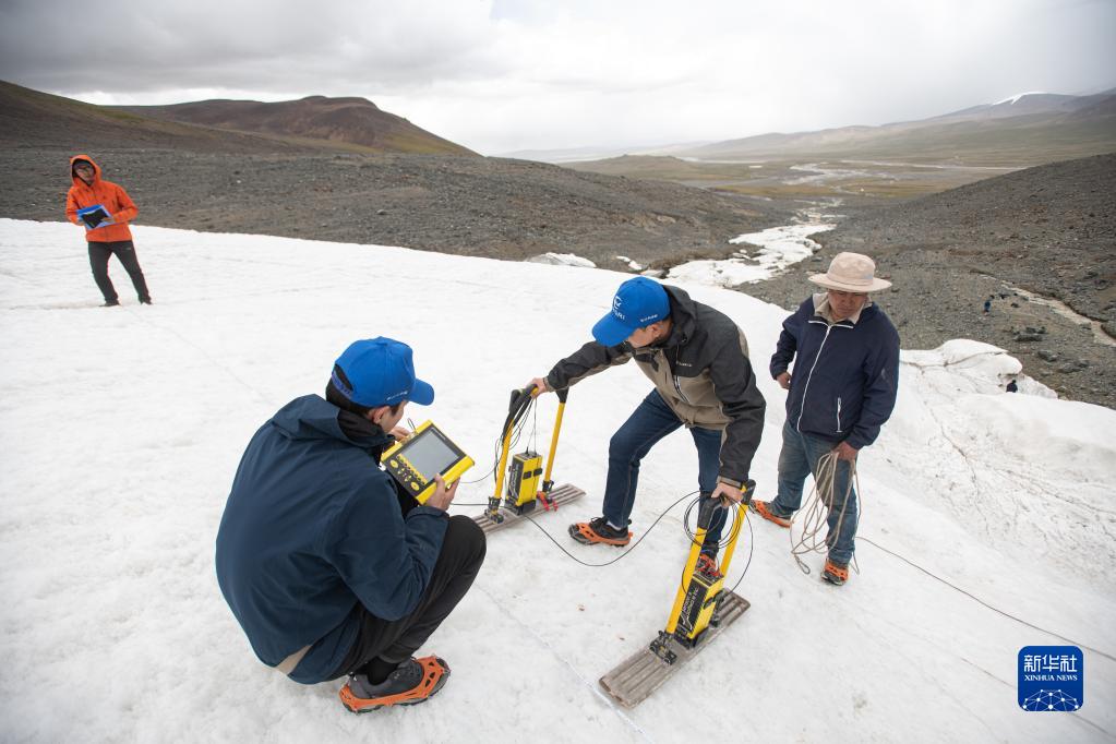 7月28日,在格拉丹東雪山,來(lái)自長(cháng)江科學(xué)院的科考隊員定培中(左一)、董士琦(左二)、范越(左三)在使用地質(zhì)雷達探測冰川。冰川觀(guān)測是2022年江源綜合科學(xué)考察的重要內容之一。來(lái)自長(cháng)江科學(xué)院的科考隊員們首次使用地質(zhì)雷達,結合遙感等技術(shù),探測江源冰川厚度,匡算冰儲量。