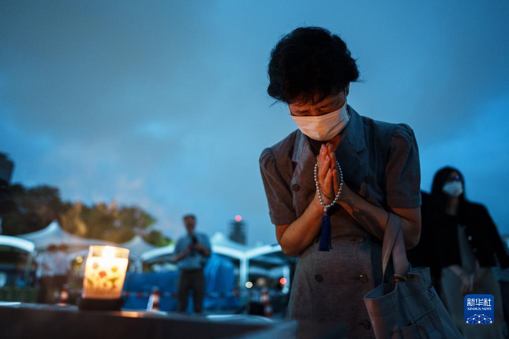 8月6日,一名女子在日本廣島和平紀念公園的和平都市紀念碑前祈禱。
