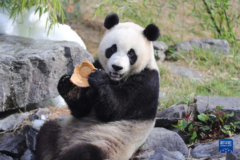 8月6日,在比利時(shí)布呂熱萊特的天堂動(dòng)物園,大熊貓“寶妹”享用“生日大餐”。