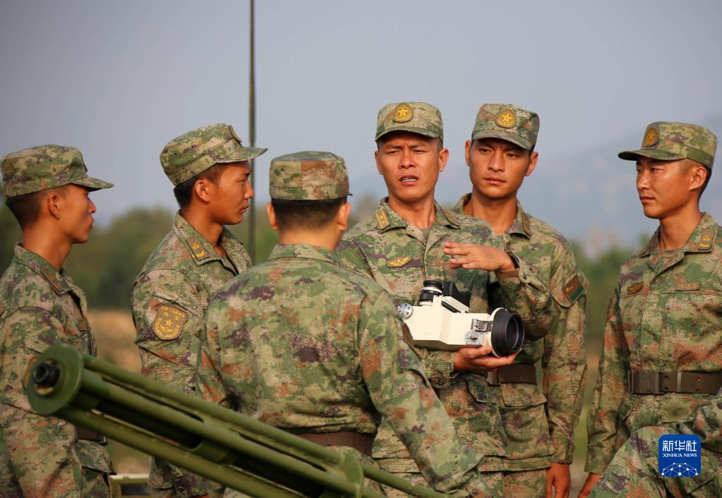 第73集團軍某旅合成營(yíng)營(yíng)長(cháng)陳松(中)與技術(shù)骨干探討革新器材使用情況(7月27日攝)。新華社記者 張永進(jìn) 攝