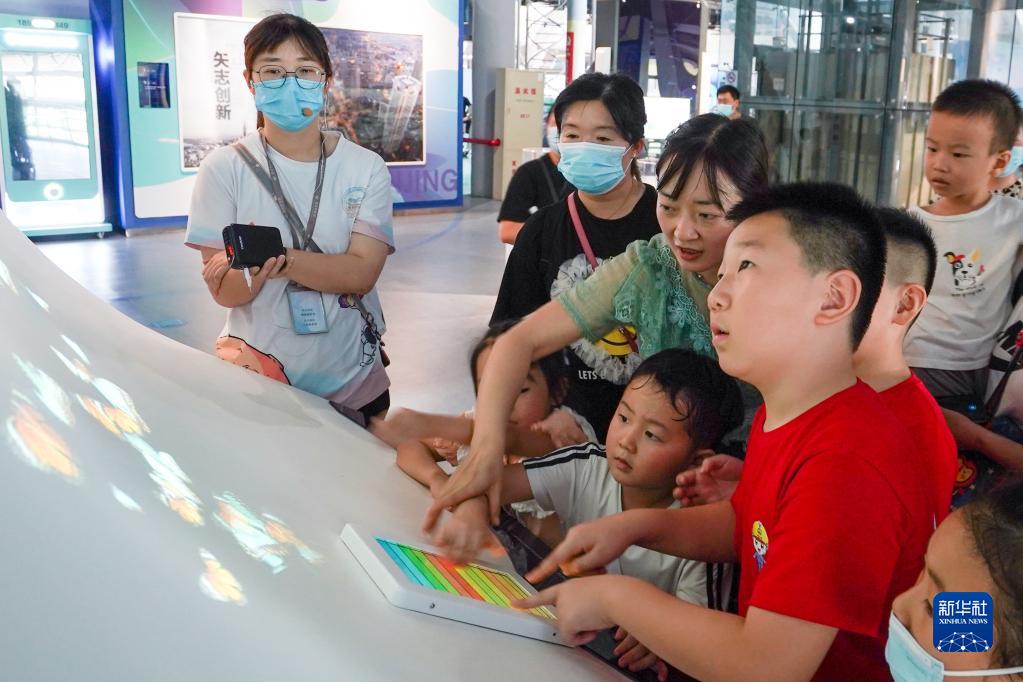 小朋友們和家人一起在南京科技館參觀(guān)(8月6日攝)。