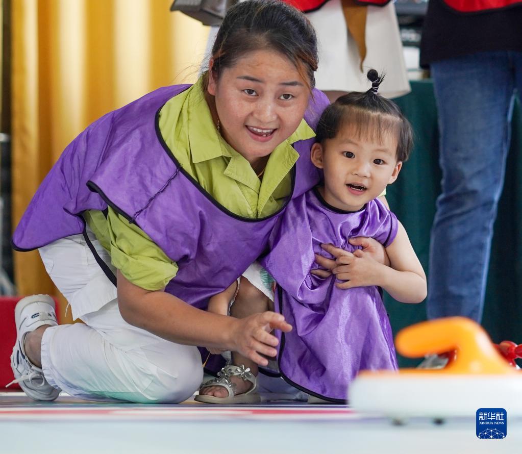 小朋友和家人一起參加“陸地冰壺”比賽(8月6日攝)。