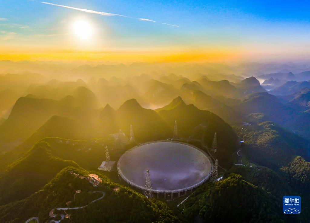 晨曦中的“中國天眼”全景(無(wú)人機照片,2022年7月25日維護保養期間拍攝)。