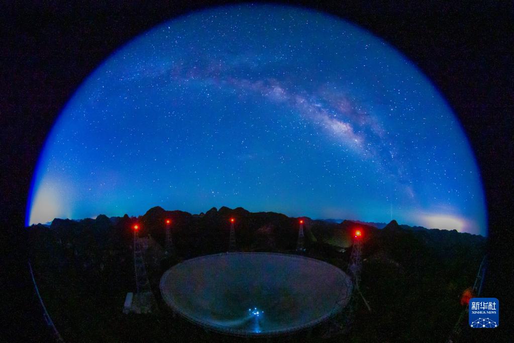 銀河下的“中國天眼”全景(2022年7月24日維護保養期間魚(yú)眼鏡頭拍攝)。