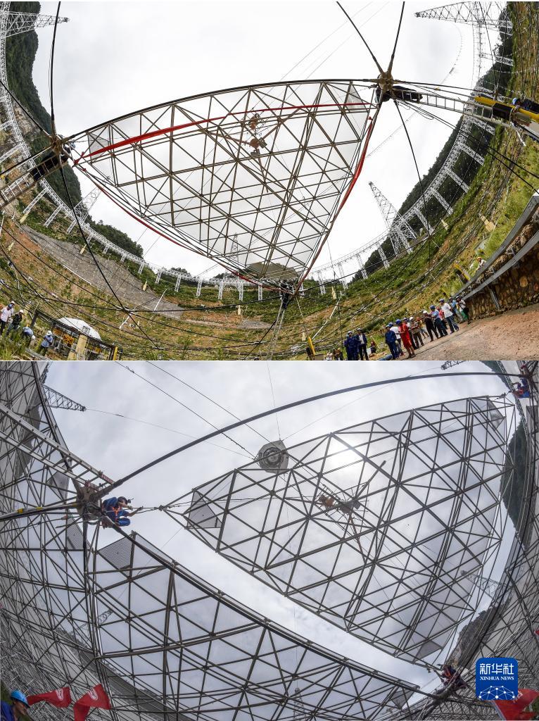 拼版照片:上圖為2015年8月2日拍攝的“中國天眼”首塊面板安裝成功;下圖為2016年7月2日拍攝的“中國天眼”吊裝最后一塊反射面板。