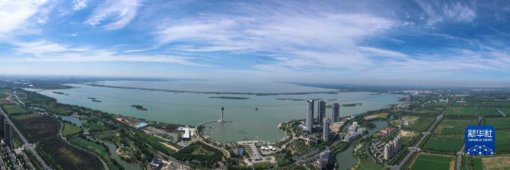 8月7日拍攝的武進(jìn)區西太湖(滆湖)攬月灣景區(無(wú)人機全景照片)。