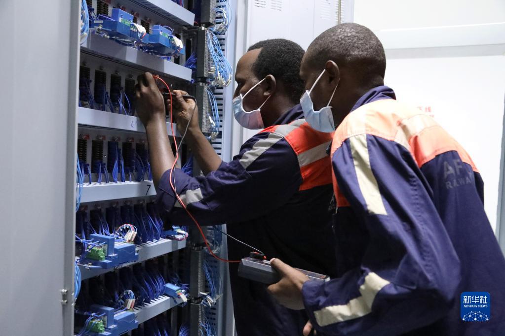 7月27日,信號工丹尼爾(左)和帕特里克在肯尼亞蒙內鐵路蒙巴薩終點(diǎn)站檢查信號設備。