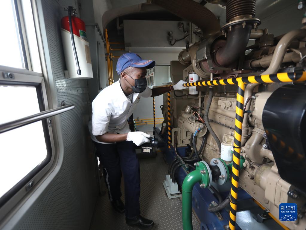 7月29日,發(fā)電車(chē)乘務(wù)員福斯汀在肯尼亞蒙內鐵路客運列車(chē)上檢查設備。