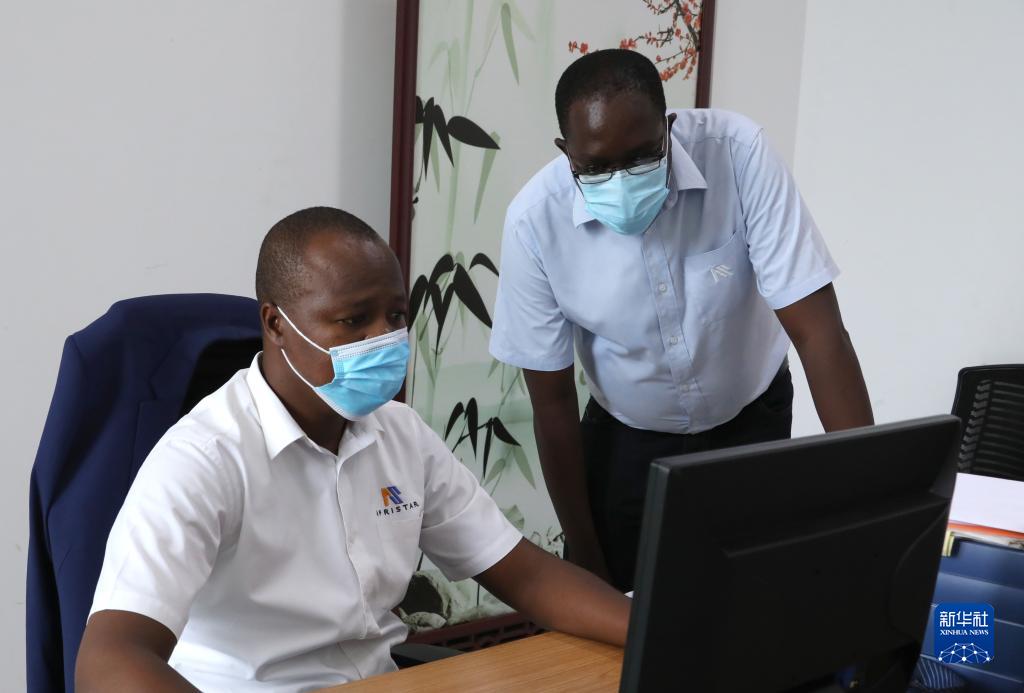 7月27日,肯尼亞蒙內鐵路蒙巴薩終點(diǎn)站站長(cháng)科斯馬斯(右)與客運主任彼得森在辦公室工作。