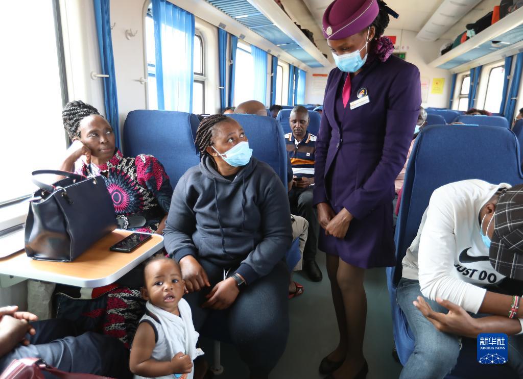 7月29日,列車(chē)員菲奧娜(站立者)在蒙內鐵路客運列車(chē)上與乘客交流。